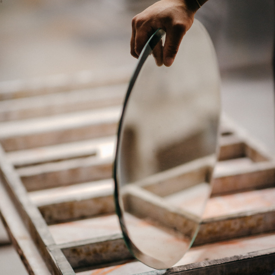 M Nuance façonne depuis dix ans des miroirs éco-responsables, en verre français, découpés et biseautés à la main dans un atelier artisanal près de Porto. Chaque pièce est unique grâce à son biseau irrégulier. Ils évoquent des flaques d’eau murale : un reflet organique et singulier pour sublimer vos intérieurs.
