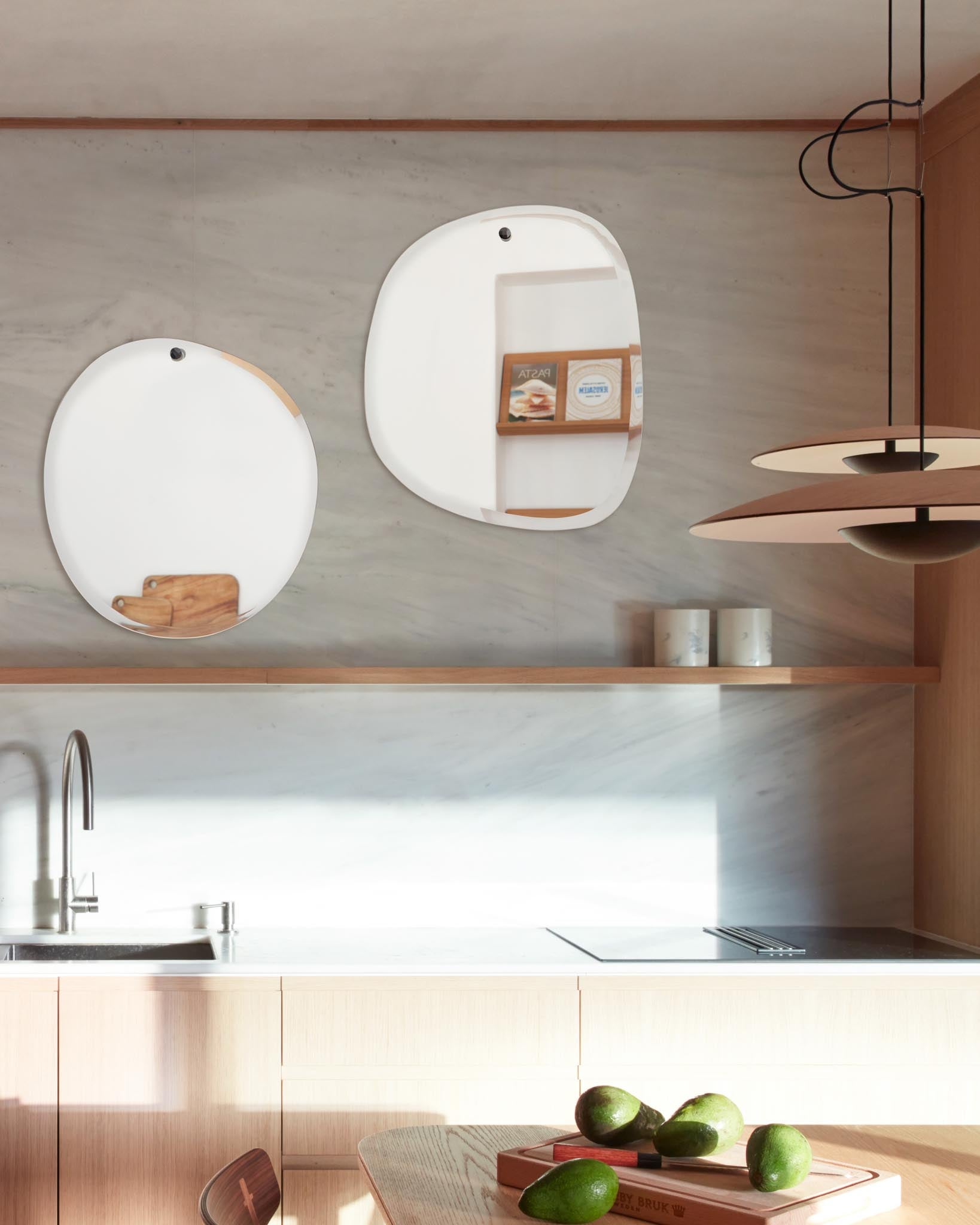 Un trou biseauté permet une fixation à l’aide d’une vis martelée, pour un rendu extra-plat. Les miroirs se transforment alors en flaques d’eau murales. Ils portent tous le nom d’un lac, telles des étendues d’eau pures et silencieuses. On peut jouer avec les formes pour créer des compositions inspirantes. Des miroirs intemporels au reflet organique et singulier pour sublimer vos intérieurs!