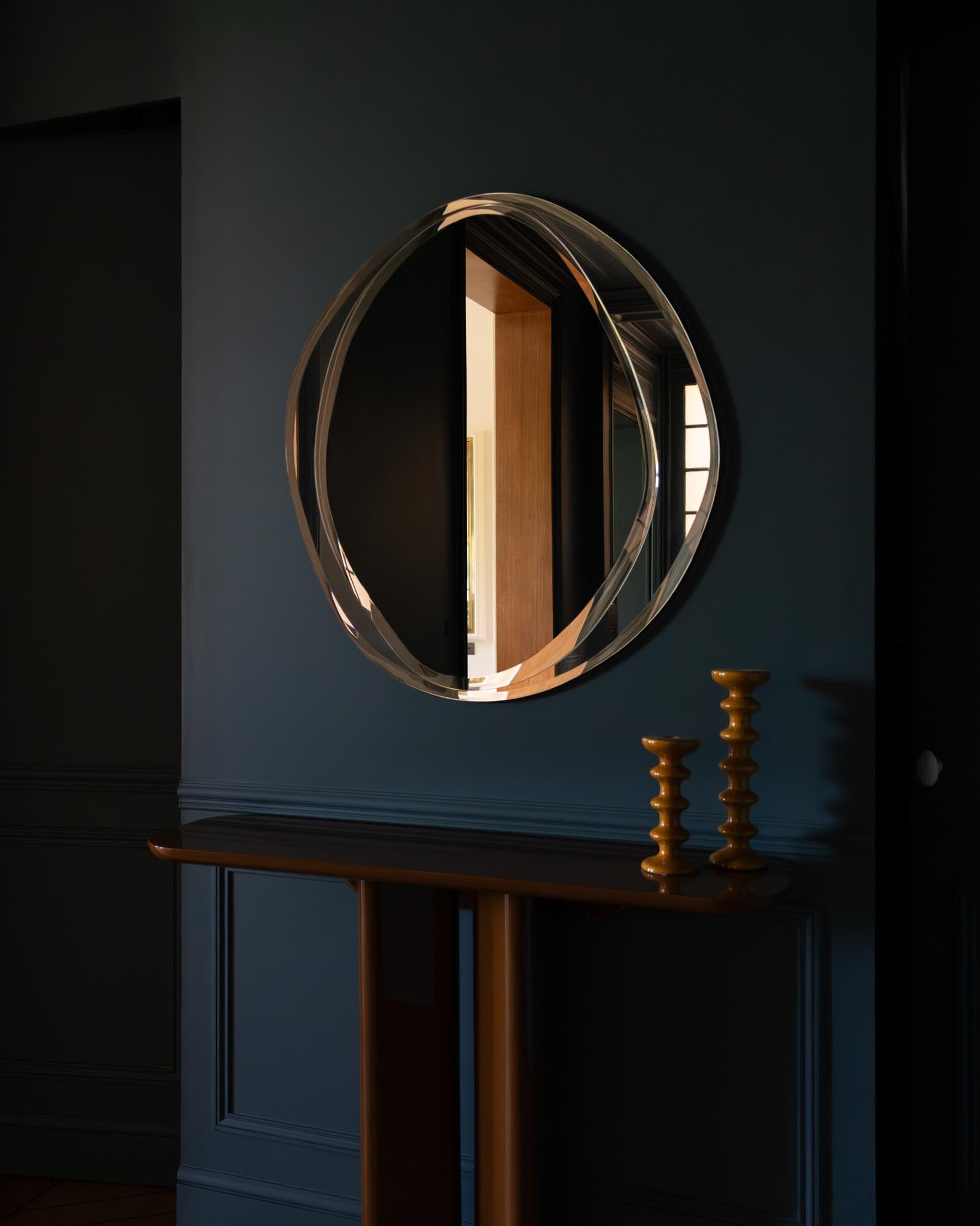 Ce double miroir crée un jeu de nuances et de reflets subtils, souligné par les deux biseaux irréguliers qui captent et dévient la lumière.
